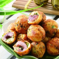 ③油炸糖糕做法:配方:中筋面粉1100克、白糖200克(夹心带馅糖糕不加白糖)、泡多源Q型50克、开水1800克。工艺:1.将白糖(夹心带馅糖糕不加白糖)与1000克干面粉拌匀,然后淋入热水,一边加热水一边用擀面杖由慢至快搅拌,搅数十圈至面团粘稠,且看上去有一层一层的感觉时,即可放到案板上降温至凉,用手沾水曡面(折面),防止生面疙瘩。泡多源与100克干面粉拌匀,加水调成糊状。面糊与熟面团放一起活匀,即可开始炸糖糕。2.制作糖糕的方法通常有两种。一是将加了糖的烫面团,根据需要制成50~100克不等的小剂,分别在每个剂子表面抹一层油后,或拍成厚1.5厘米、直径约3厘米的圆饼,或是将抹有油的面剂制成椭圆形的饼,入油锅炸制。二是烫面时未加糖的烫面团,则要包入馅心(如红糖、豆沙、枣泥、果酱、莲蓉等),在包制时,注意不要把馅心沾到糖糕表面,否则炸制时会出现黑斑点。3.炸制糖糕的方法先把炸锅置火上,烧热后注入半锅油,待油温烧至五成热时,逐个下入糖糕生坯。下锅后,切忌用勺推动糖糕生坯,以免糖糕坯相互挤压变形,不过可以用快速晃锅的方法使糖糕不粘连且不接触锅底。待糖糕浮起时,可以离火(或将火调成最小)再“僵”炸5分钟,捞出沥油。注意:“僵炸”是炸制糖糕的技术关键。如果长时间用大火或中火炸制,糖糕会出现外熟内生(俗称“溏心”)现象,甚至会因内部空气膨胀,使糖糕爆裂。另外,若是没采用“僵炸”的方法,那炸成的糖糕会干瘪无光,有如“死”饼。