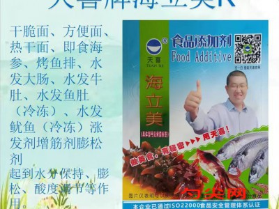 ★功能作用:〔海立美K型〕用于干脆面、方便面、热干面、即食海参、烤鱼排、水发大肠、水发牛肚、水发鱼肚(冷冻)、水发鱿鱼(冷冻)等方便米面制品、冷冻米面制品、焙烤食品、预制肉制品、熟肉制品、冷冻水产品、冷冻鱼糜制品,起到水分保持、膨松、酸度调节等作用。