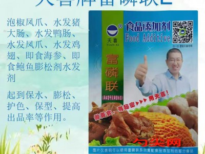 ★功能作用:〔富磷联E型〕用于泡椒凤爪、水发猪大肠、水发鸭肠、水发凤爪、水发鸡翅、即食海参、即食鲍鱼虎皮凤爪等预制肉制品、熟肉制品 、熟制水产品,起到保水、膨松、护色、保型、提高出品率等作用。