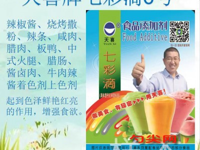 ★功能作用:〔七彩滴6型〕用于辣椒酱、烧烤撒粉、辣条、咸肉、腊肉、板鸭、中式火腿、腊肠、酱卤肉、牛肉辣酱、鸡肉辣酱、猪肉辣酱、膨化玉米棒玉米果等腌渍的蔬菜、熟制坚果与籽类(仅限油炸坚果与籽类)、糖果、方便米面制品、粮食制品馅料、腌腊肉制品类 (如咸肉、腊肉、板鸭、中式火腿、腊肠)、熟肉制品、调味品(12.01盐及代盐制品除外) 、膨化食品,起到色泽鲜艳红亮的作用,增强食欲。〔七彩滴6型〕还可用于广式腊肠、糯米肠、无磷烤肠、炖猪蹄、爆汁脆皮肠、烤肠、糯米红肠、卤猪皮卷、腊肉肠、脆皮肠、玉米脆皮肠、脆嫩小酥肉等。