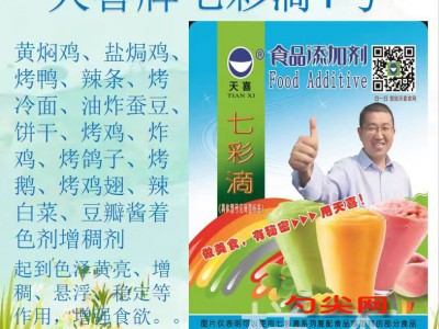 ★功能作用:〔七彩滴1型〕用于黄焖鸡、盐焗鸡、烤鸭、辣条、烤冷面、油炸蚕豆、饼干、烤鸡、炸鸡、烤鸽子、烤鹅、烤鸡翅、辣白菜、豆瓣酱、烧烤撒粉、炸鸡架、铁板烧鸭等食品,起到色泽黄亮、增稠、悬浮、稳定等作用,增强食欲。〔七彩滴1型〕使用色素为天然提取物,放心使用。〔七彩滴1型〕还可用于无磷烤鸡翅、无磷卤鸡爪、烤鸡皮等。