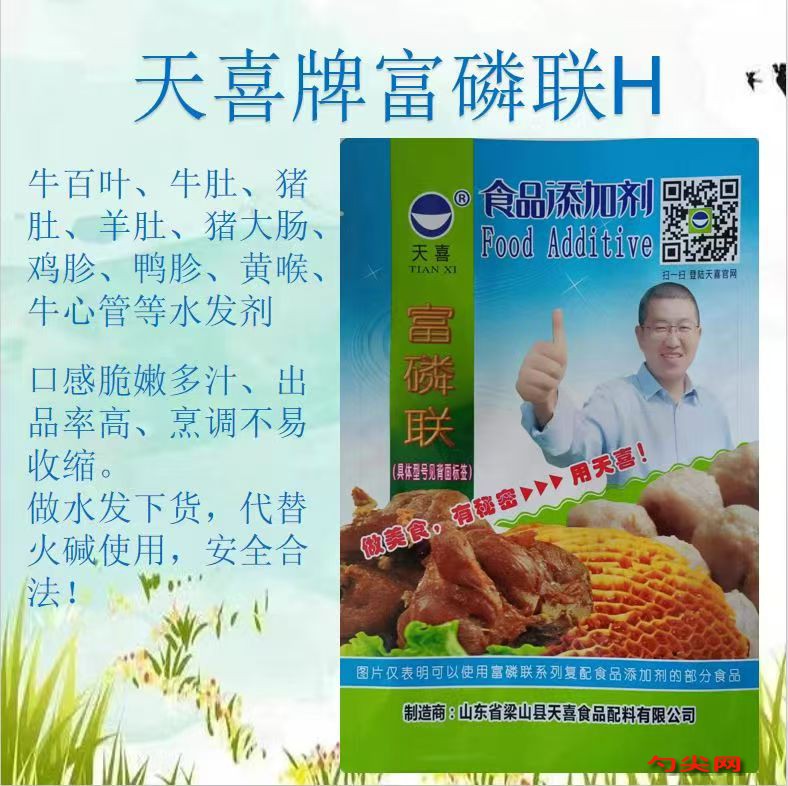 ★商品名:天喜牌富磷联H型 产品名称:富磷联牌复配水分保持膨松剂1 型号:FLL-H 本品按照《食品安全国家标准 食品添加剂使用标准GB2760》及补充规定的品种、应用分类、使用范围、最大使用量、残留量等科学组方,并且按照《食品安全国家标准 复配食品添加剂通则GB26687》精心配制而成。本品已经通过食品生产许可,保障食品安全。用户按照本说明的用法用量生产制作的预制肉制品(食品分类号:08.02);熟肉制品(食品分类号:08.03既不会超标也不会超量。★配料表:磷酸三钠、碳酸钠、三聚磷酸钠、焦磷酸钠、碳酸氢钠、谷氨酰胺转氨酶。