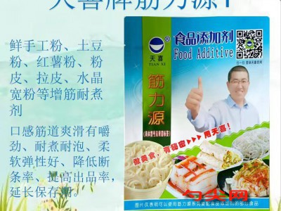 ★功能作用:[筋力源T型]制作的粉丝粉条、粉皮、拉皮、宽粉、自熟粉条等口感筋道爽滑有嚼劲、耐煮耐泡、柔软弹性好、降低断条率、提高出品率,延长保存期。特别适用于土豆淀粉、红薯淀粉、木薯淀粉、绿豆淀粉制作鲜粉条、鲜粉皮、鲜拉皮、鲜水晶宽粉等。 [筋力源T型]还可用于东北大拉皮等。
