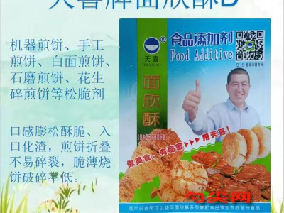 ★功能作用:采用本品加工制作的手工白面煎饼、机器白面煎饼、石磨煎饼、花生碎煎饼以及以小麦粉为主的混合粉煎饼等焙烤食品、裹粉、油炸面制品口感膨松酥脆、入口化渣,煎饼折叠不易碎裂,脆薄烧饼破碎率低。各类杂粮煎饼可以添加泡多源K型。 〔面欣酥D型〕还可用于松脆煎饼果子、花生夹心薄煎饼、松脆菜煎饼、酥脆白面煎饼等。
