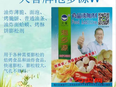 ★功能作用:〔泡多源W型〕用于油炸薄脆、面泡、烤脆饼、普通油条、油炸面蛤蟆、烤酥饼等各类食品可以起到膨松、稳定、酸度调节等作用。主要用于各种需要膨松的焙烤食品和油炸食品,快速膨松,膨松较大,气孔不规则。〔泡多源W型〕还可用于玉米面饼干、火锅豆腐等。