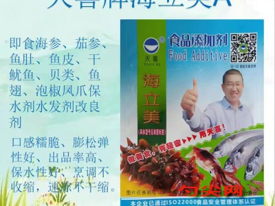 ★温馨提示:1.本品达不到火碱(氢氧化钠)的水发效果,如果购买使用海立美的目的就是为了使海参增重或增大,请不要选购海立美。2.本品不具有防腐保鲜作用,即食海参等熟制水产品防腐保鲜可以添加0.2%美久亭G。3.冷冻水产品后油炸的可以使用海立美Q型或海立美F型。4.水产品罐头可以使用海立美G型。