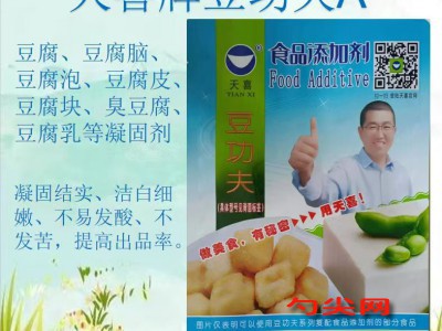 ★功能作用:[豆功夫A型]加工制作的豆腐、豆腐脑、豆腐泡、豆腐皮、豆腐块、臭豆腐、豆腐乳等豆类制品凝固结实、洁白细嫩、不易发酸、不发苦,每斤大豆豆腐出品率高达5斤、豆脑出8斤以上,豆腐运输不易出水、不易碎,保水时间长达6小时。[豆功夫A型]还可用于火锅豆腐、豆腐泡、豆腐乳、豆腐干、豆腐串、油炸豆泡等。