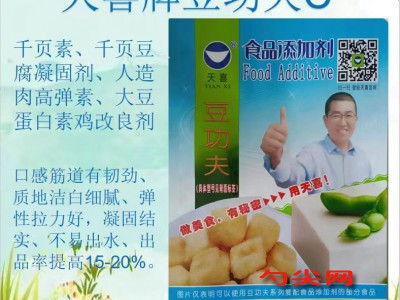 ★功能作用:[豆功夫C型]加工制作的千页豆腐、人造腐竹、素鸡、人造肉、大豆蛋白制品等豆类制品口感筋道有韧劲、质地洁白细腻、弹性拉力好,凝固结实、不易出水、出品率提高15-20%。