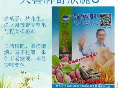★功能作用:采用〔舒欣脆C型〕加工制作的炒瓜子、炒花生、烤花生、烤坚果等带壳坚果与籽类口感松脆、膨松饱满、易于化渣、果仁不易发硬、不易变味变色。〔舒欣脆C型〕还可用于糖炒栗子等。